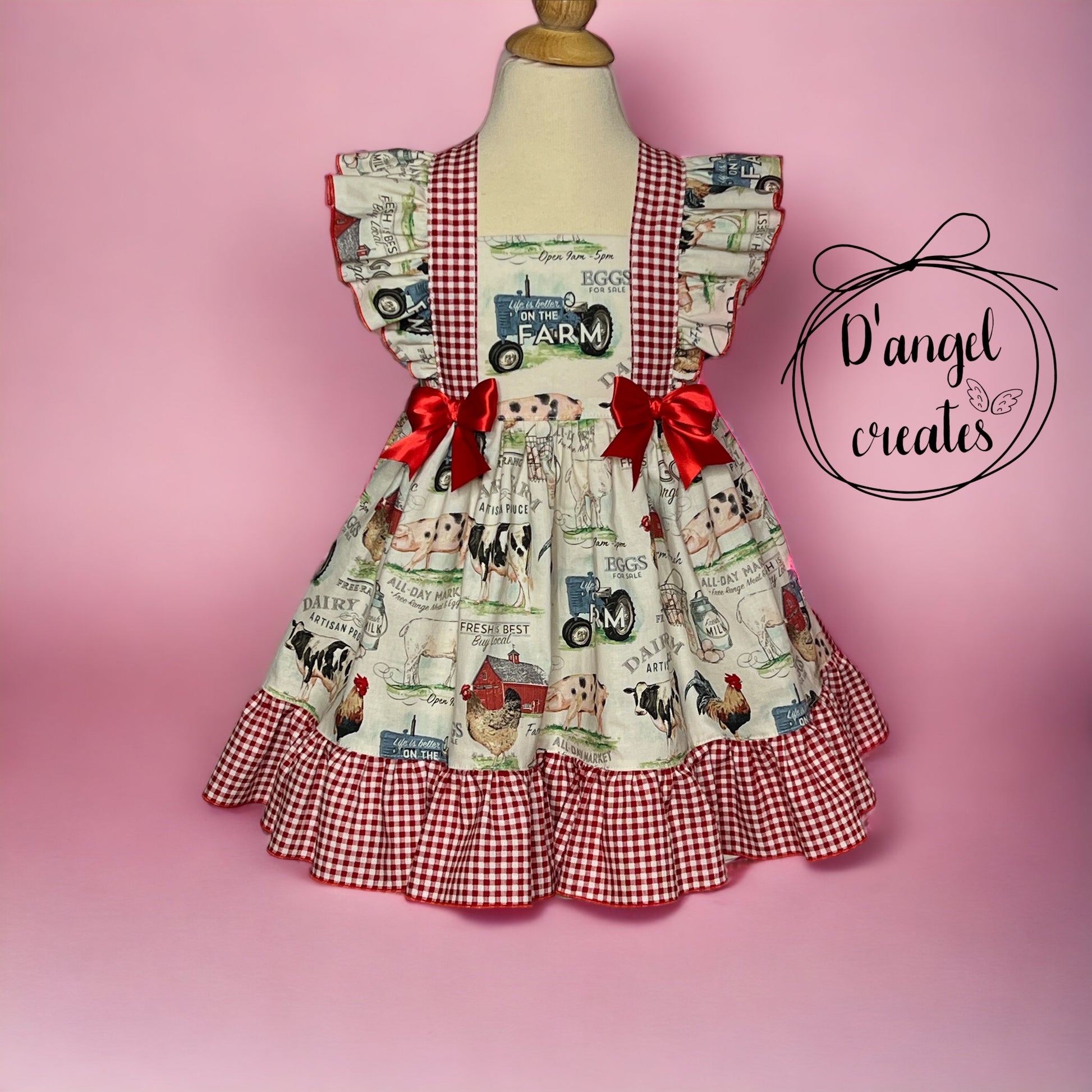 This super cute Farm Dress is made with 100% cotton fabric. The bodice is created with elastic in the bottom back and two loops where you put the straps and closes with a bow. The front of the bodice has two satin ribbons for a complete vintage look.