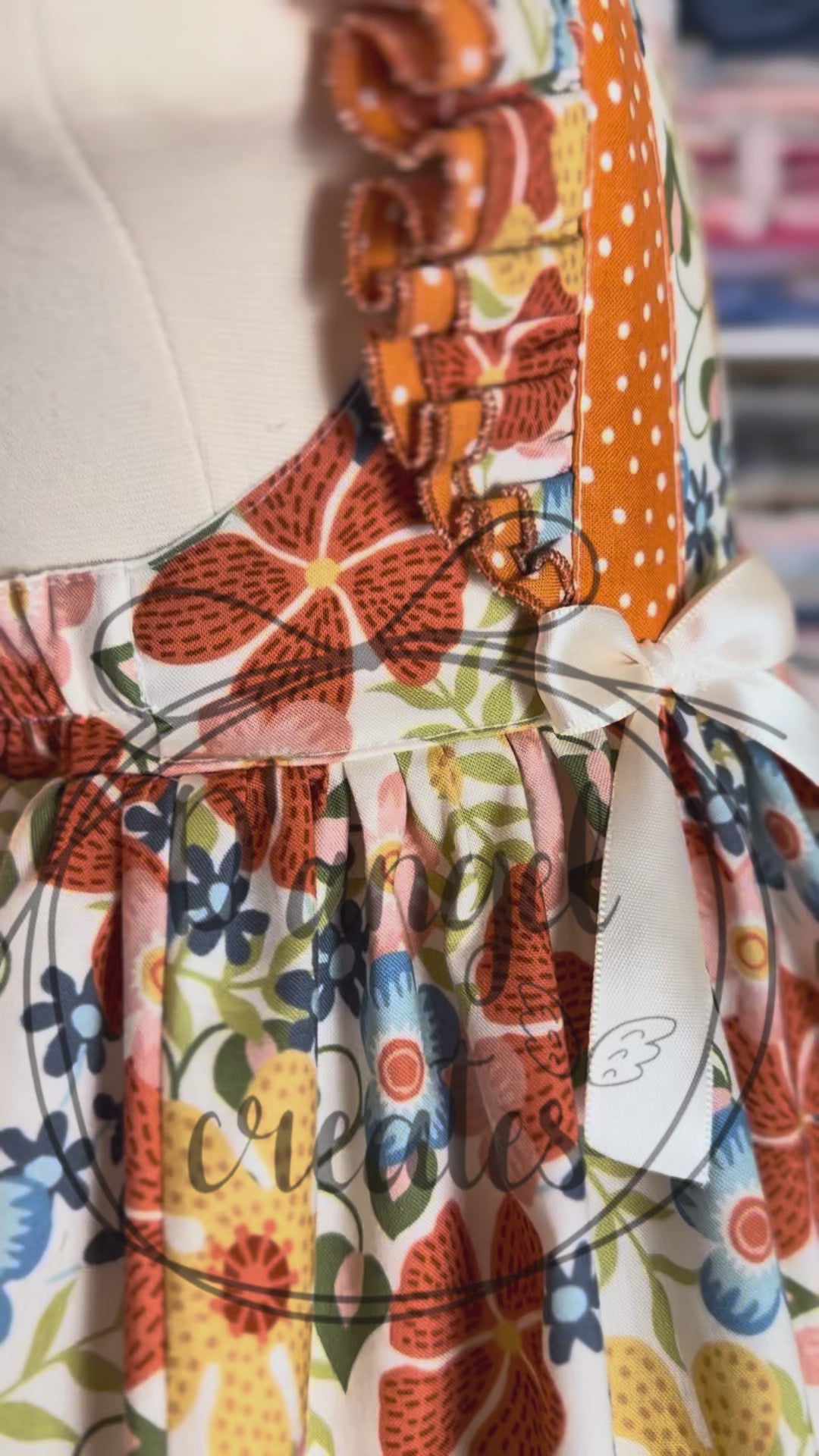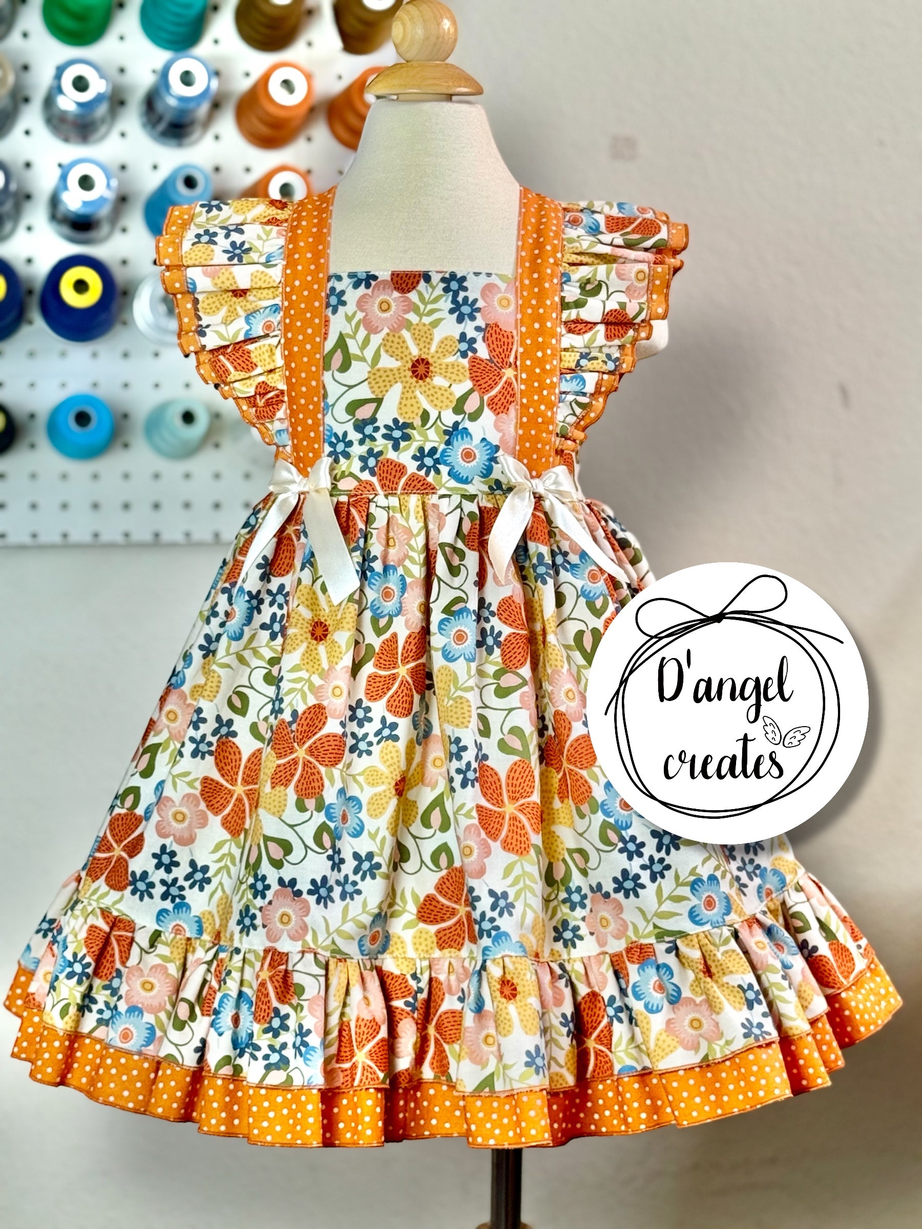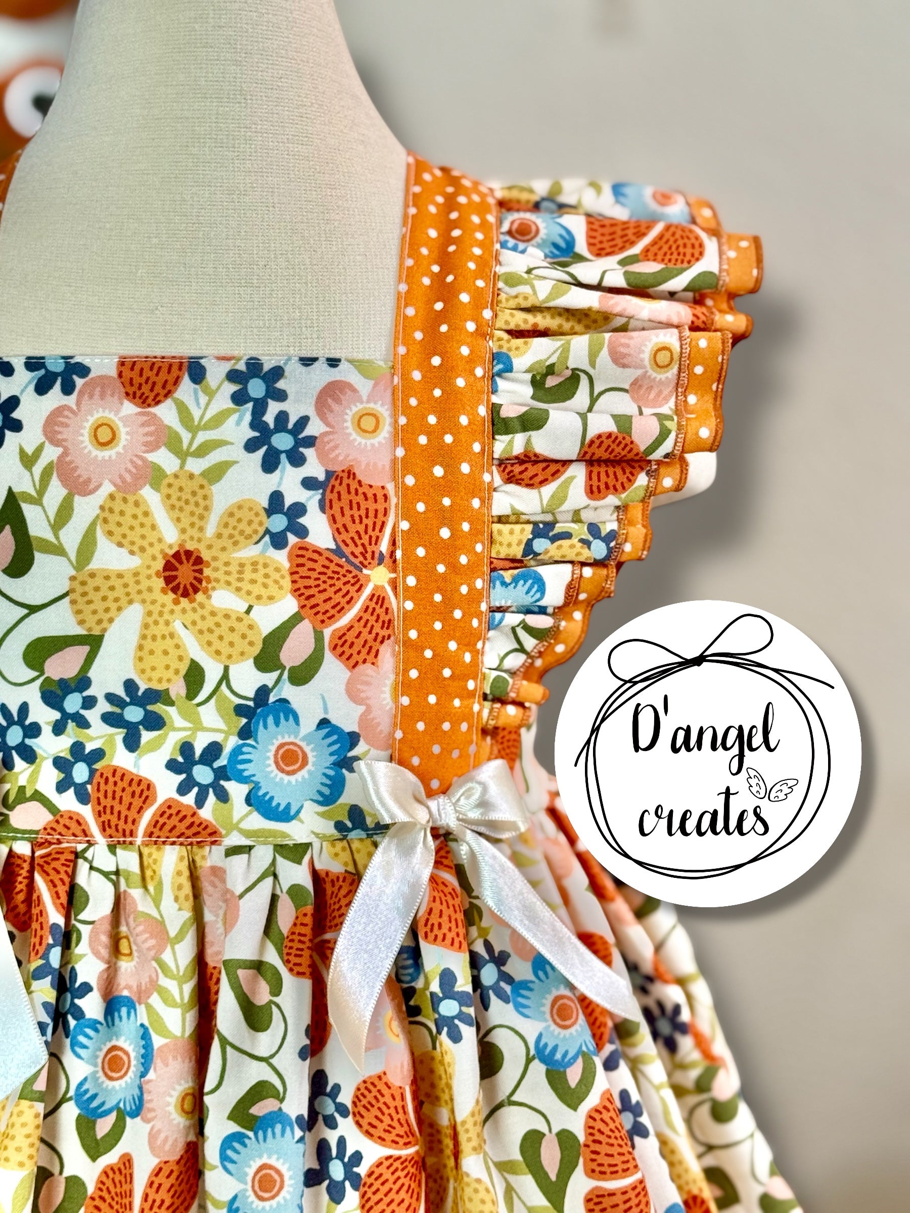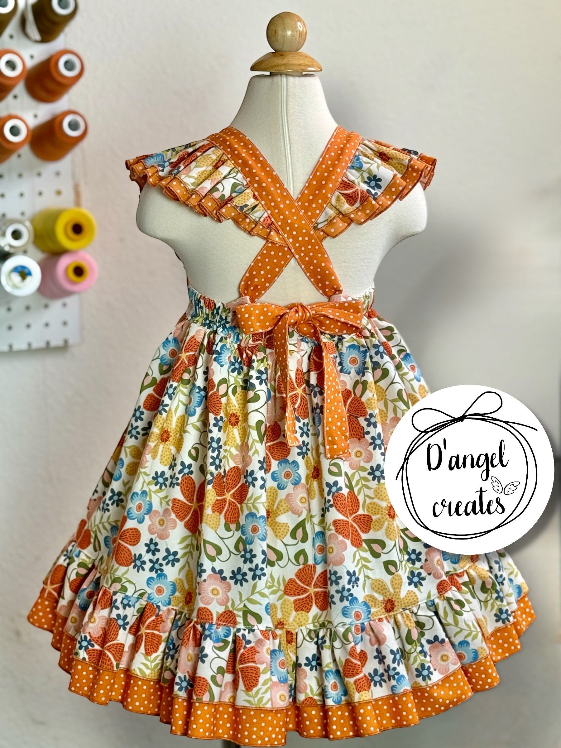 This adorable Orange Flowers Blossom Dress is made with 100% cotton fabric. The bodice is created with elastic in the bottom back and two loops where you put the straps and closes with a bow. The front of the bodice has two satin ribbons for a complete vintage look. It also has double ruffles in the front and in the skirt as well.