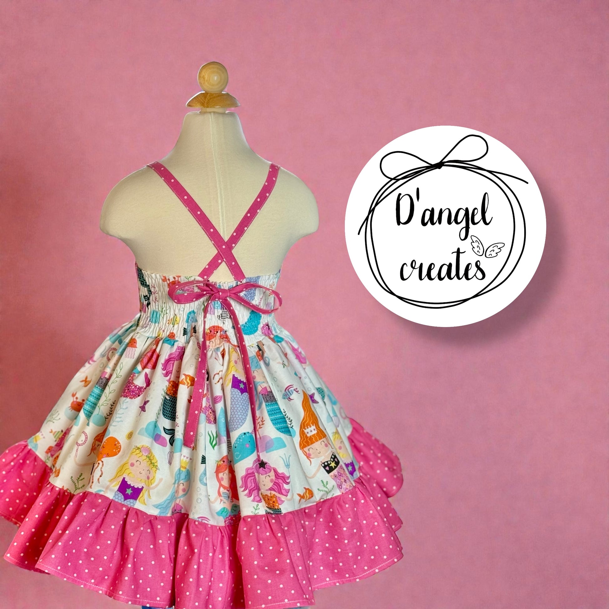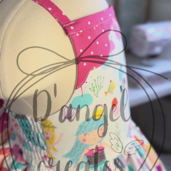 Adorable Mermaid Party Dress! is made with 100% cotton fabric. The bodice is created with elastic in the back and closes with a beautiful bow. The bodice has two scalloped detail contrast fabric matching the ruffles on the bottom skirt. It has great volume perfect for twirling!