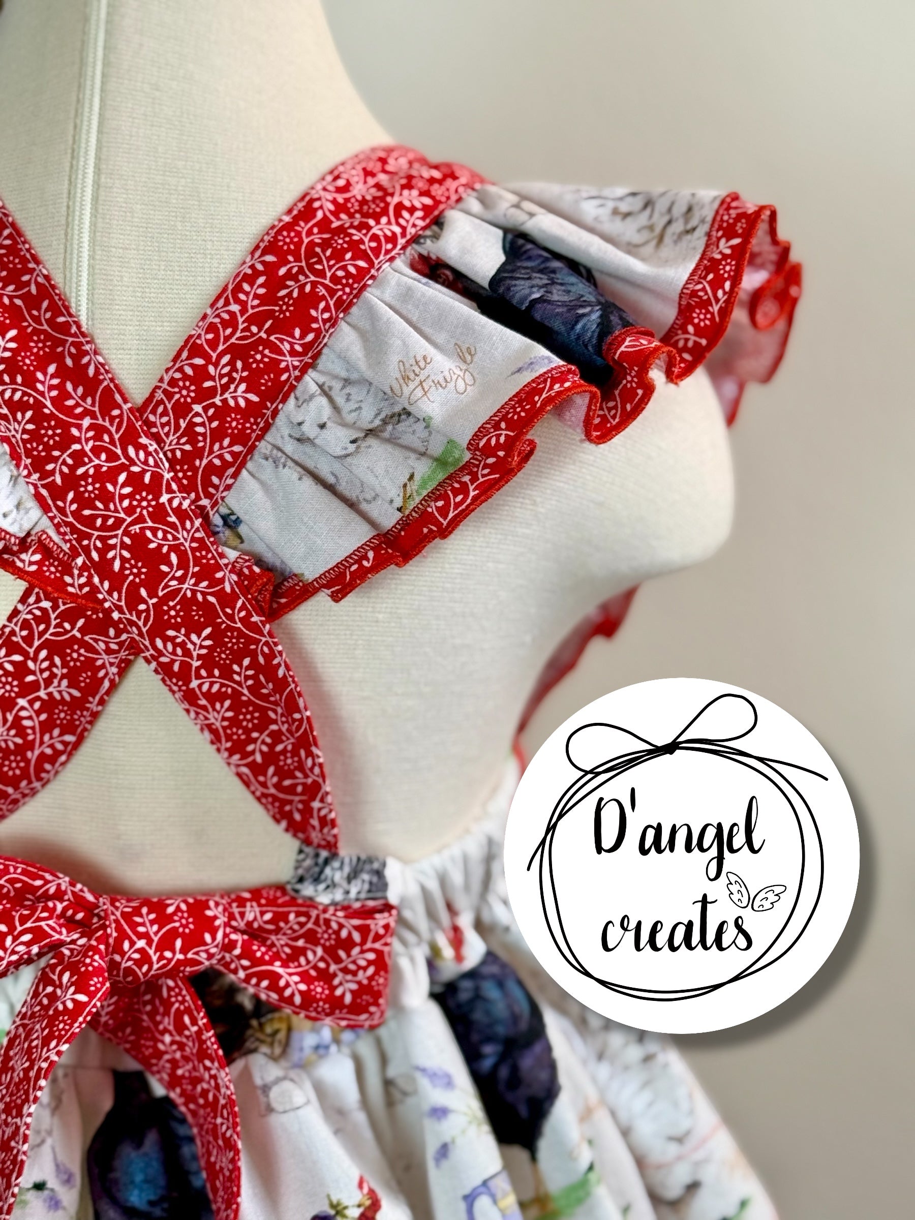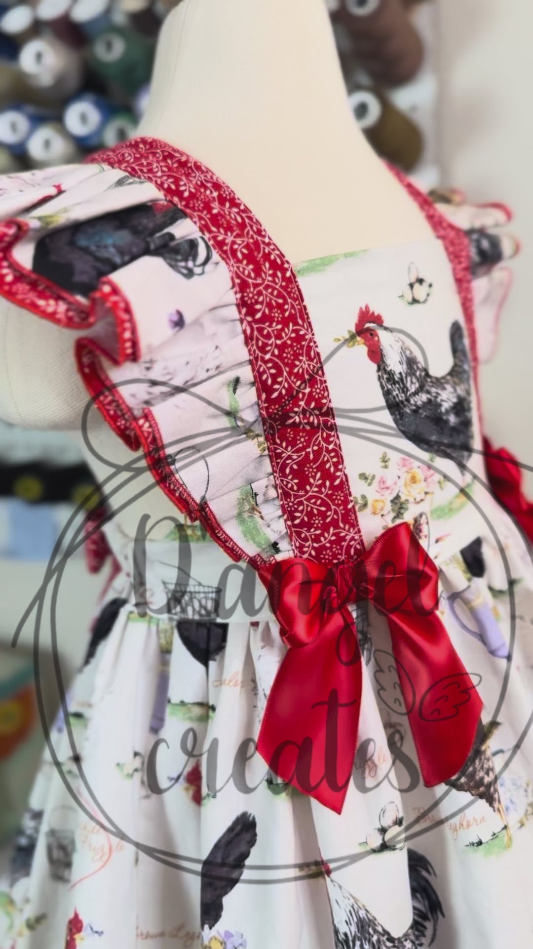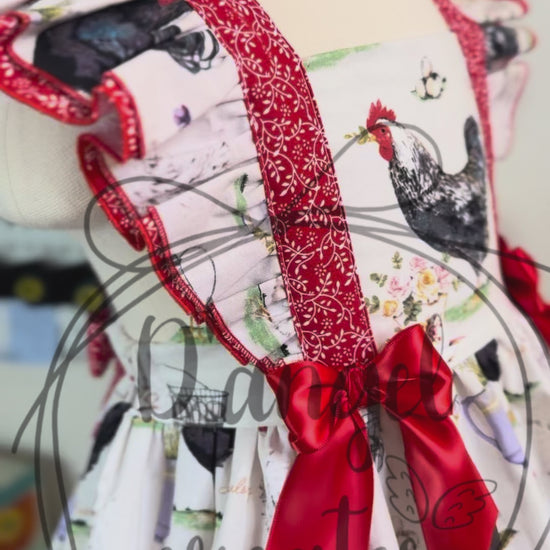 This adorable Chicken Farm Dress is made with 100% cotton fabric. The bodice is created with elastic in the bottom back and two loops where you put the straps and closes with a bow. The front of the bodice has two satin ribbons for a complete vintage look. It also has double ruffles in the front and in the skirt as well.