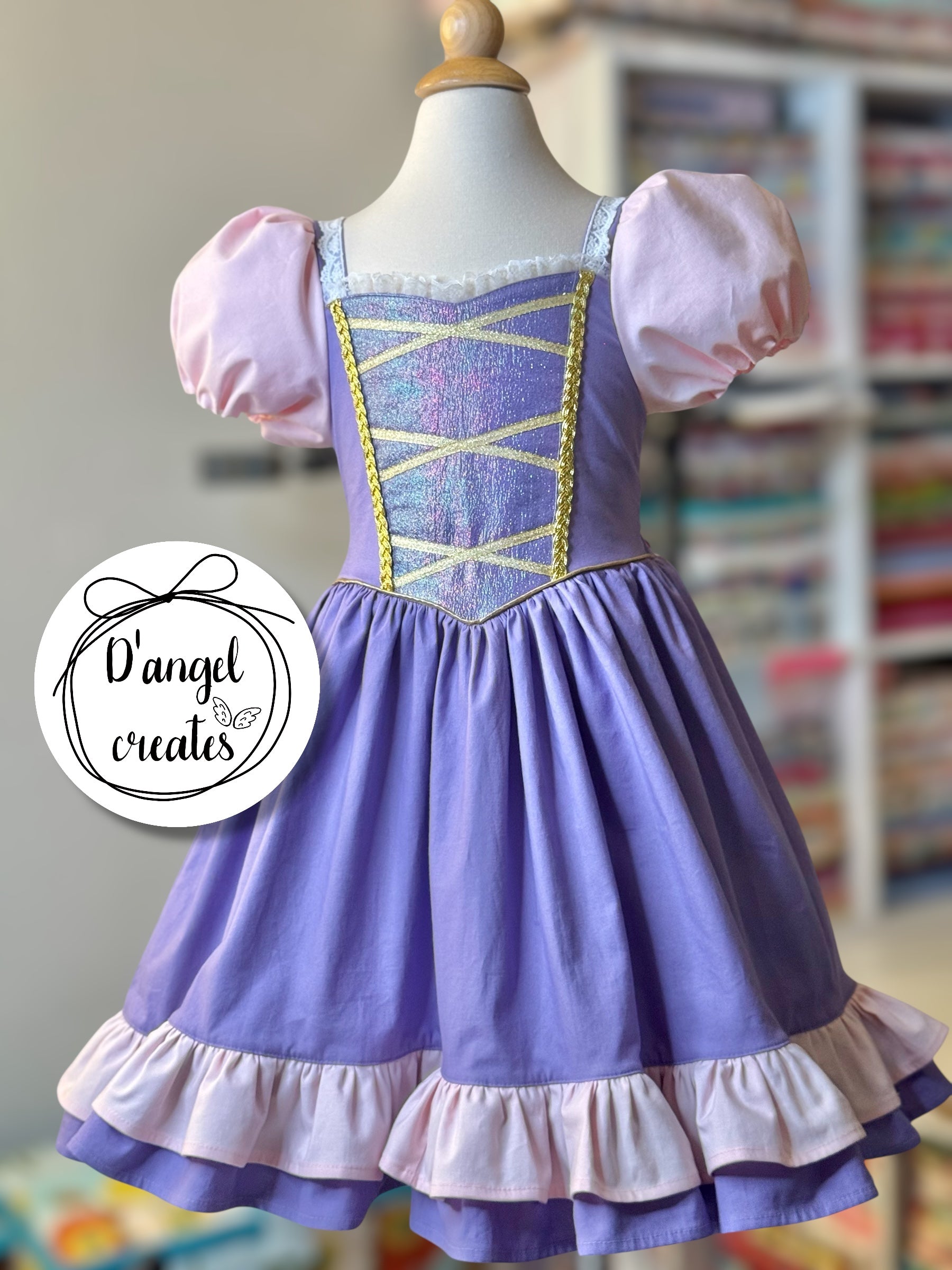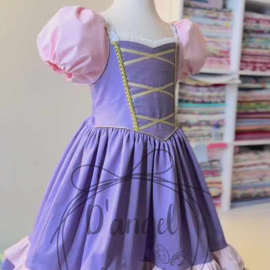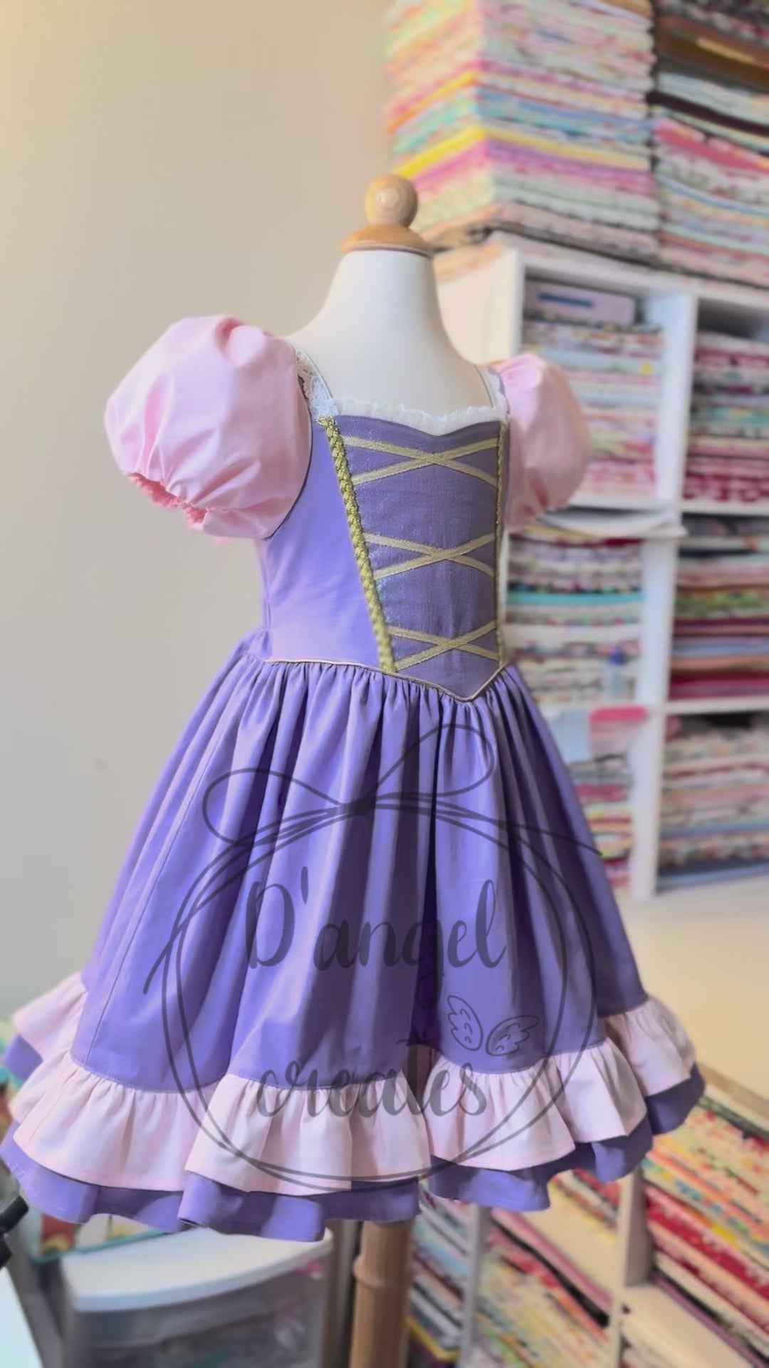 This adorable Rapunzel Princess Dress is made with 100% cotton fabric. The bodice has pink double puffy sleeves, a heart shape at the front with golden, lace trims and shiny panel with crossed golden ribbon, also a pointy front bodice attached to the skirt with a golden trim to create the unique princess look. It has elastic in the bottom back and open back with straps that closes with a bow. The skirt is single with a double ruffle at the bottom.